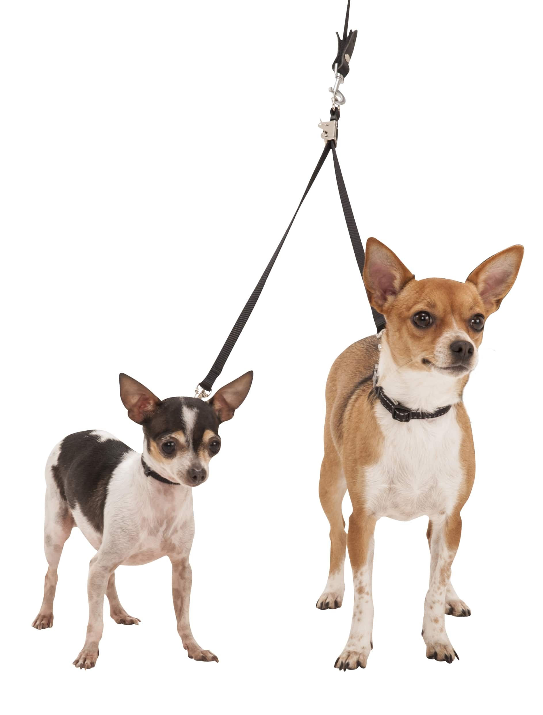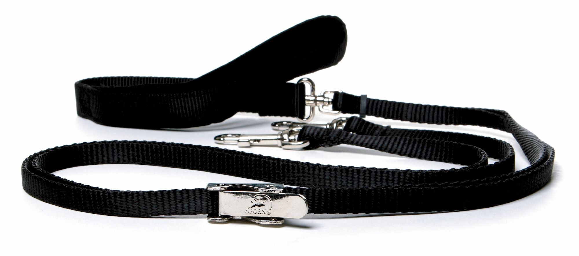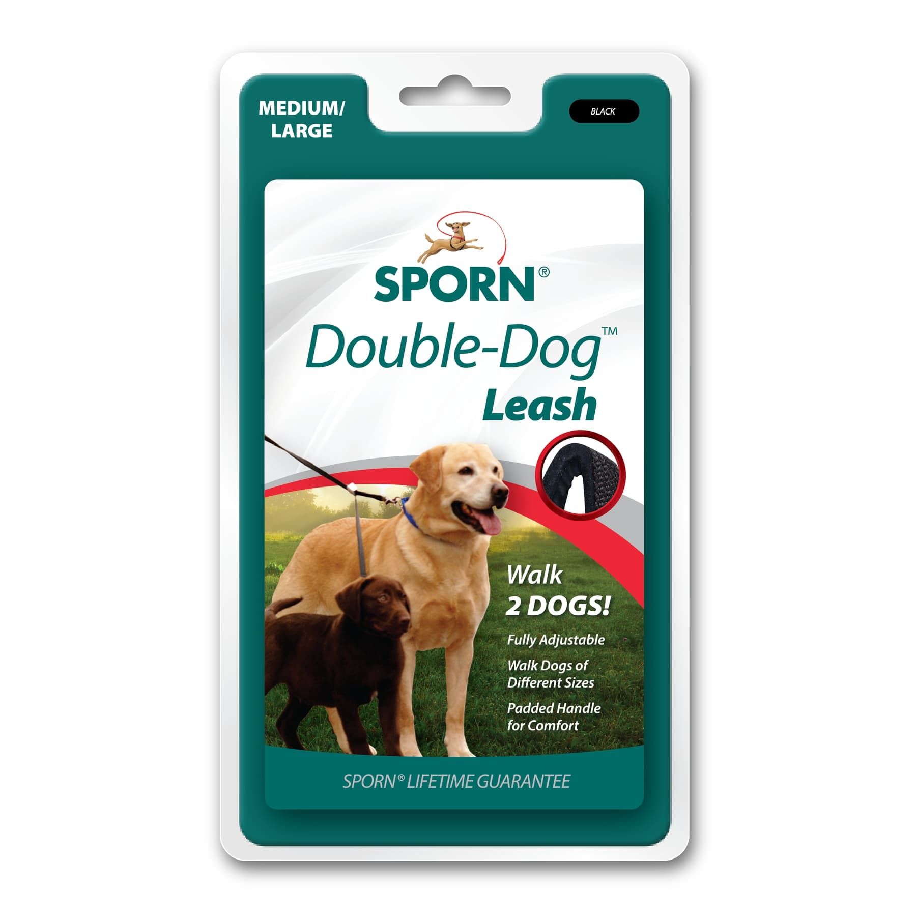 Walk two dogs at once with the Sporn Double-Dog™ Leash. This fully adjustable leash gives you the option of walking two dogs close together or far apart, and even lets you walk dogs of different sizes. The no-tangle design, patented Adjusti-Buckle and plush padded handle ensure a stress-free walk for you and your pups. The straps are made of quality nylon webbing, and all metal parts use durable custom nickel-plated steel for reliable strength.