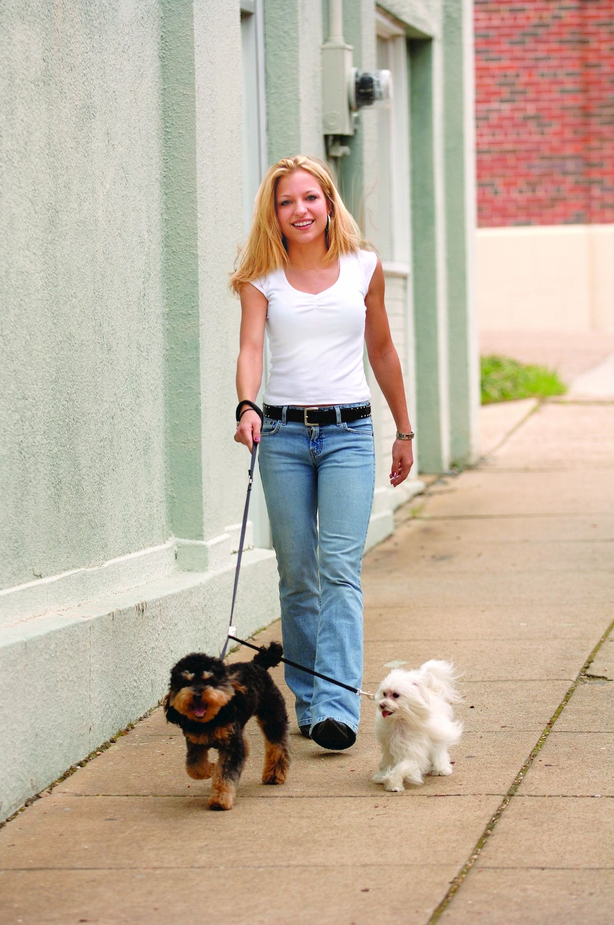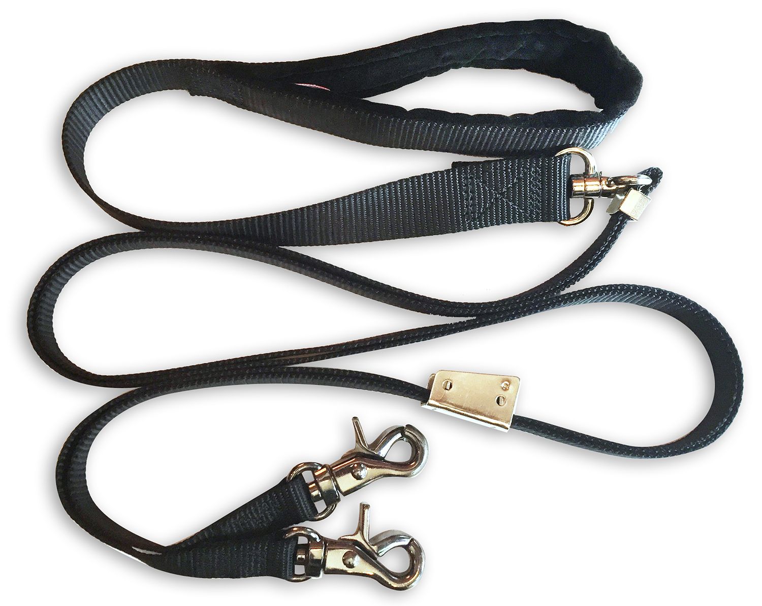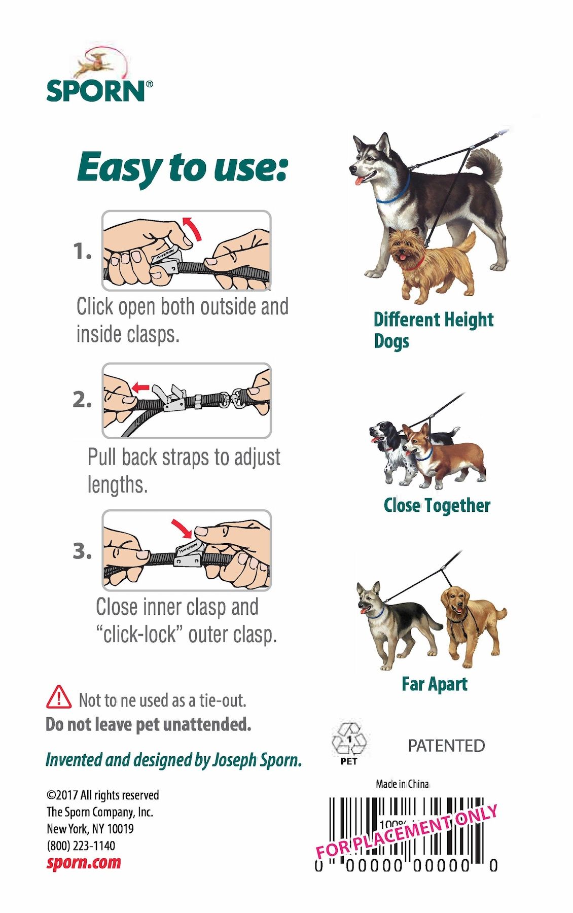 Walk two dogs at once with the Sporn Double-Dog™ Leash. This fully adjustable leash gives you the option of walking two dogs close together or far apart, and even lets you walk dogs of different sizes. The no-tangle design, patented Adjusti-Buckle and plush padded handle ensure a stress-free walk for you and your pups. The straps are made of quality nylon webbing, and all metal parts use durable custom nickel-plated steel for reliable strength.